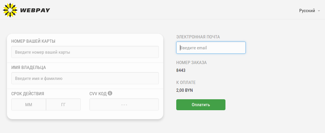 Система электронных платежей WEBPAY™ - это удобное средство расчётов за товары и услуги в сети Интернет. Это возможность произвести оплату за Ваш заказ, используя пластиковую карточку VISA или MasterCard. БЕЛКАРТ. Безопасный сервер WEBPAY устанавливает шифрованное соединение по защищенному протоколу TLS и конфиденциально принимает от клиента данные его пластиковой банковской карты (номер карты, имя держателя, дату окончания действия, и контрольный номер банковской карточке CVC/CVC2).